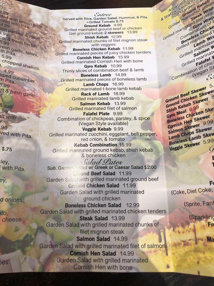Grilled marinated thin juicy chicken tenders shaped as a leaf. Served with rice, garden salad, hummus, and pita.
